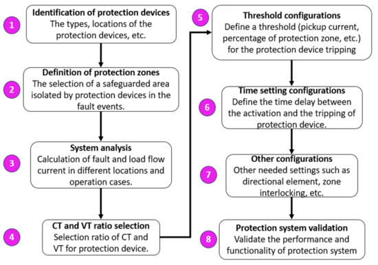 Figure 4 shows the methodology for protection device setting configuration. The authors believe that this methodology can be applied in every type of protection system, such as fuse, overcurrent protection relay, and distance protection relay. To obtain the effective protection device configuration, these steps must be followed: