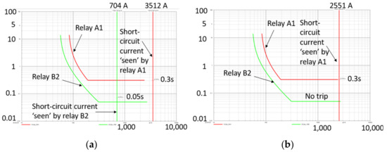 Figure 7. Relay A1 and B2 characteristic. (a) Short circuit occurs in the middle of Line 1–2, and (b) short circuit occurs at bus 2.
