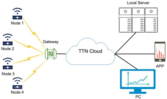 Traditionally, the long-range wide area network (LoRaWAN) protocol has established itself as one of the most effective technologies for internet of things (IoT) applications, offering long-distance connectivity with low power consumption. This technology is particularly suitable for environments where other communication solutions might be unfeasible due to limited range or high power consumption. In particular, LoRaWAN enables data transmission over several kilometers, with devices featuring long battery life and low cost, making it an ideal choice for low-cost, distributed IoT networks [1]. In a LoRaWAN network, a star-type topology is usually employed where gateways act as intermediaries, transmitting messages between nodes and a central network server. Such gateways connect to the network server using internet protocol (IP) links over wired or wireless technologies. Also, nodes communicate with the gateways using LoRa- or frequency shift keying (FSK)-modulated point-to-point wireless links [2,3].