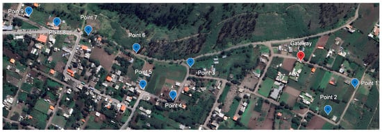 For the measurement campaign, in Figure 3, we illustrate a detailed view of the coverage and performance of the system as a function of distance and the specific conditions of the rural environment. Specifically, data were collected at nine points (blue markers) located at various distances from the node to the gateway (red marker).