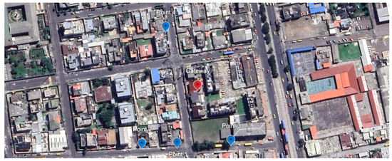 On the other hand, for the scenario in Figure 4, note that the environment is exposed to a significantly higher level of interference, which could negatively affect the range of the radio link compared to the rural environment. In particular, the gateway was installed on the terrace of a building in the La Florida zone, in the north of Quito. This location is characterized by its density of buildings and possible obstructions, which introduces a greater number of obstacles and sources of interference for the radio signal. For this setup, the tests were carried out at four different points (blue markers) within this urban area. These points were selected to assess the system’s performance in more complex conditions and to measure how urban interference impacts the quality of communication and the range of the radio link.