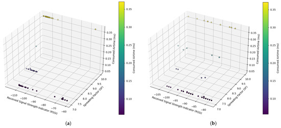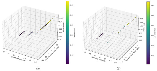 In both Figure 7, the expected behavior of air-time is observed as a function of SF and SNR. As SF increases, air-time also increases, which is consistent with the nature of LoRa modulation, since higher SF implies longer transmission duration. Also, SNR seems to influence air-time, with higher SNR values associated with lower air-time, reflecting the system’s ability to improve transmission in cleaner signal conditions. The general alignment of the points suggests predictable and consistent behavior in both urban and rural environments.