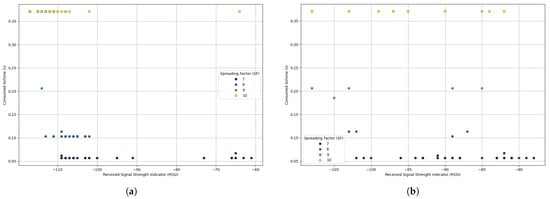 Figure 6 exemplifies the RSSI vs. Consumed Airtime Scatterplot results grouped by SF, demonstrating that stable and effective communication is ensured. It is important to note that the variation in consumed airtime depends not only on the RSSI value, but also on the SF. Lower RSSI values (approximately between −105 dBm and −100 dBm) are associated with higher consumed airtime when the SF is higher (e.g., SF values of 9 or 10). This suggests that even if the signal is weak, communication can still be stable by increasing the SF, albeit at the cost of higher airtime. Therefore, efficient communication, especially in the trade-off between SF and RSSI, is experimentally verified, considering the specific needs of the network and the environment in which the system is deployed.