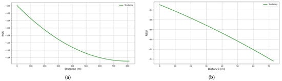 RSSI as a function of Distance. (a) Scenario rural; (b) Scenario urban.
