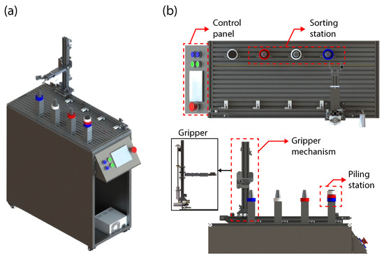 (a) CAD model of the classification system based on color analysis. (b) Components of the upper part of the machine in conjunction with the mechanism for classifying objects.