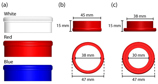 For the station, disc-shaped pieces were developed that were placed on the main upper structure to be classified. In this case, they were made up of two main components: The first is the lower disc that had a smaller internal diameter and the second component had a larger internal diameter (see Figure 2), which were joined under pressure. Its composition was made in this way for ease of manufacturing and for saving materials. The colors used for classification were white, blue, and red.