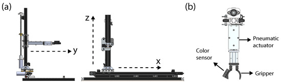 In addition to the aforementioned ideas, other aspects have been considered in the literature. The use of a Cartesian arm, positioned as a square station on top of the working area, offers advantages in the classification process. It allows students to develop algorithms and control strategies more easily, enhancing their understanding and proficiency in working with robotic arms for effective object manipulation [21]. Furthermore, the accurate identification of object position is crucial in the classification process. The use of artificial vision to identify the color, shape, and position of the pieces has demonstrated 100% accuracy in all inspections conducted [22]. Open-source solutions, such as using a Raspberry Pi for color identification, have been explored. These solutions involve utilizing a camera to capture images, which are then analyzed pixel by pixel to identify RGB colors. Additionally, shape analysis is performed to determine the object’s position. This approach achieves accurate color readings and employs two microcontrollers, including an Arduino for robotic arm control [23].