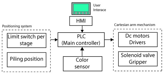 An HMI screen was integrated for process control, maintaining a constant interaction with the PLC. Moreover, power and emergency stop buttons, complete with their respective pilot lights, were installed. The electronic block diagram is depicted in Figure 4.