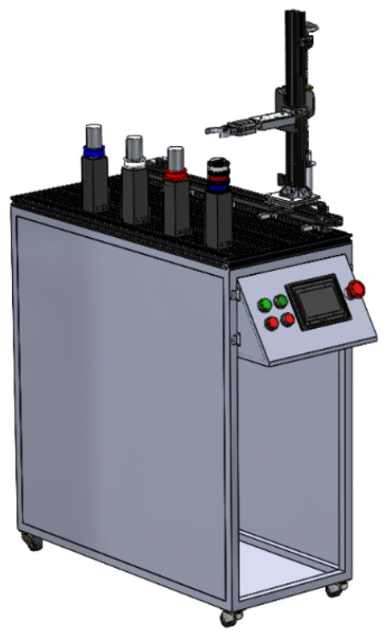 The machine’s structure was developed and assembled internally, along with the cartesian arm system for sorting. The entire device can be seen in detail in Figure 5. As observed, the sorting structure is located at the top of the machine. Additionally, the control panel is located at the front of the structure, featuring various power and emergency stop buttons, as well as pilot lights to indicate if the machine is powered on (green) and if pieces are available (yellow). The HMI touch screen is located in the same section, allowing us to control the machine’s different processes, either manually or automatically. Primarily, the process for using the machine involves first turning it on, placing the pieces to be sorted at the starting point, and selecting the sorting mode. For a better understanding of the aforementioned process, the machine’s functionality can be visually appreciated at the following link, which shows the sorting process: https://youtu.be/IA7_wQ3IJ_M (accessed on 26 August 2024).