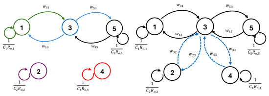 Graphs of the system with five interconnected tanks with closed control valves (left) and open control valves (right) between tanks 2, 3, and 4.