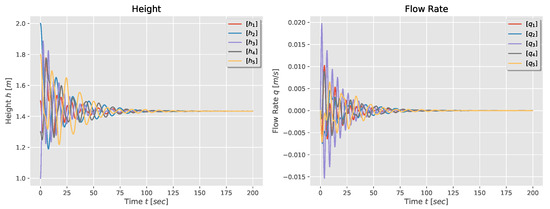 Finally, the natural response of the five-tank system for a first-order and second-order model are shown in Figure 7 and Figure 8. Again, one observes that the tanks’ height and flow rate reach consensus: the heights converge to the weighted average of the initial heights, while the flow rates converge to zero.