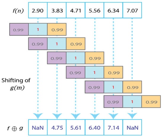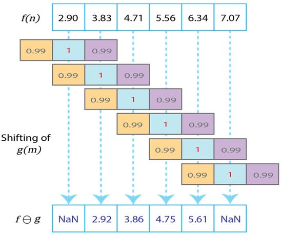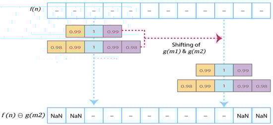 To comprehend the operation of weighted dilation and how the SE moves through each sample of the signal, refer to (1) and Figure 1. This figure displays a signal of length , which is dilated by an SE of length . The domains of g and are and , respectively, where is the length of the signal under analysis, and is the length of the structuring element, with the condition .