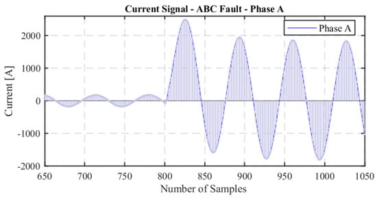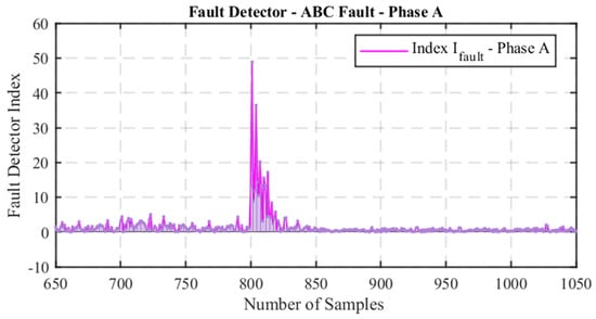Figure 7 shows the phase A of a current during a simulated three-phase ABC fault at 0.2 s. The currents of phases A, B, and C were processed using the designed morphological tool, resulting in the characteristic illustrated in Figure 8. The index appears at the onset of the fault with a maximum magnitude of approximately 50, compared to an average value of 2.3 before the event, which represents an increase of 21.74 times compared to the pre-fault current. This indicates that a high magnitude is a clear indicator of a fault. The tool has been successfully evaluated for detecting single-phase to ground, two-phase to ground, and three-phase faults.