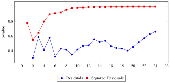 The p-values of the autocorrelation for the residuals and the squared residuals are shown in Figure 8. All of them show a probability greater than 5% for the null hypothesis, i.e., that there is no autocorrelation between the lags.