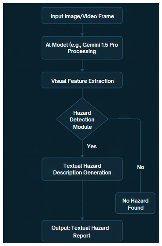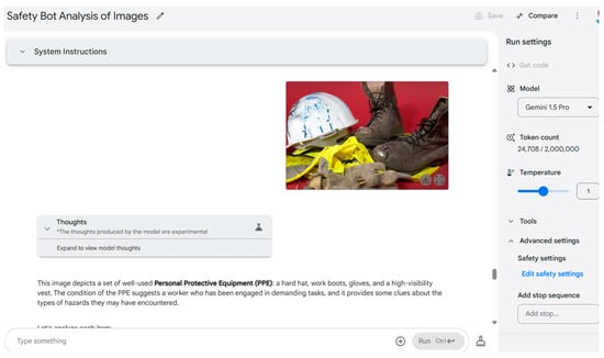 Figure 2 provides a specific example of a visual input presented to the AI models during the evaluation phase. Each model processed this image based on its internal representations adapted during the training phase and guided by the standardized evaluation prompt. An example of the user interface used for interacting with one such model, Gemini 1.5 Pro via its Developer Studio, is shown in Figure 3. Table 2 summarizes the resulting textual outputs generated by Gemini 1.5 Pro, GPT-4, and Copilot, detailing the specific hazards each model identified for the scenario depicted in Figure 2. The conceptual flow of how the AI model processes the visual input to arrive at these textual hazard descriptions is illustrated in the flowchart presented in Figure 4 and Figure 5. This overall comparison highlights the differences in detection capabilities, categorization, and descriptive detail among the models for a single test case.