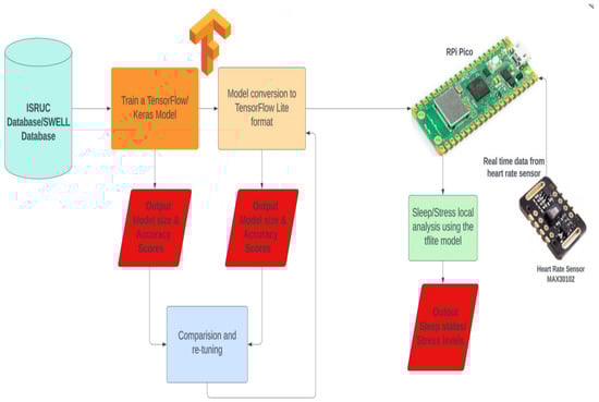 The trained model was deployed on the Raspberry Pi Pico microcontroller (Manufactured by Raspberry Pi Ltd, based in Cambridge, UK), which features 256 kB SRAM and 2 MB storage. The microcontroller was set up using the Pico SDK (versionv1.4.0), and a compatible heart rate sensor was integrated to provide real-time HRV data. Optimization techniques such as quantization and pruning reduced the computational complexity and memory footprint, ensuring efficient inference within the resource constraints of the hardware. To protect user privacy, all health data processing occurred locally on the microcontroller. Encryption ensured the confidentiality of sensitive information during storage and transmission.