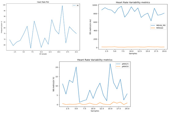 Figure 3. HRV metrics calculated from heart rate. - Real-time Stress Prediction: The TFLite model predicts stress conditions by analyzing the HRV metrics and estimating the probability of stress in real time (Figure 4). The ability to provide real-time stress assessment is a key advantage of this approach, as it allows continuous monitoring without the need for external cloud infrastructure. This not only reduces latency but also ensures that sensitive health data remain local to the device, thereby protecting user privacy.