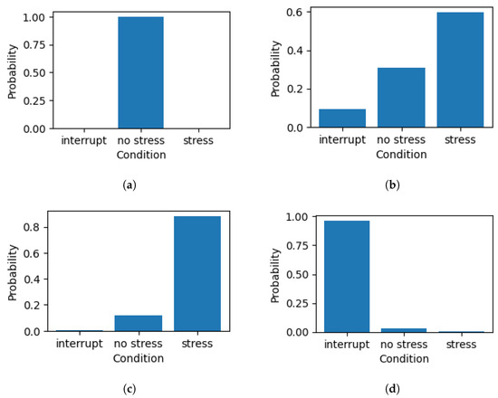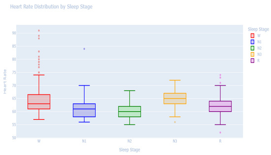 Figure 4. Different levels of stress prediction. (a) No stress. (b) Medium stress. (c) High stress. (d) Interruption during measurement. - HRV and Sleep Stage Classification: We also investigated how HRV metrics vary across different sleep stages, including wake, N1, N2, N3, and REM. This analysis revealed distinctive HRV patterns associated with each stage, which can aid in accurately classifying sleep states. The box plot (Figure 5) visualizes the variations in heart rate during these stages, providing a deeper understanding of how sleep quality and disruptions can be detected using HRV data. This finding demonstrates the potential of the model to extend beyond stress prediction and contribute to more comprehensive health monitoring, including sleep analysis.