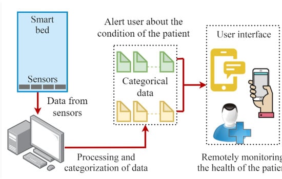 - Embedded Sensor Network: The network consists of several physiological sensors such as a temperature sensor, moisture sensor, pressure sensor, oxygen saturation sensor, movement sensor, and pulse and blood pressure sensor. These sensors are embedded in the sheets and pillows of the bedding to monitor the vital signs of the patient and detect their movements.