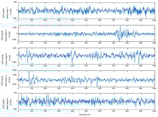 Night-time EEG recordings from the dataset [16,17] were taken for this study. The dataset comprised EEG recordings which were obtained at a sampling frequency of 512 Hz from patients exhibiting Periodic Limb Movement Syndrome (PLMS). The participants in the dataset were between the ages of 14 and 82, with an average age of 45. Of the study’s total respondents, 42% (44) were female and 58% (62) were male. A 60:40 training and testing ratio of the dataset was used in our analysis, and the sleep pattern was divided into five cycles (sleep stages) shown in Figure 4.
