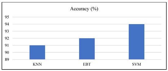To ensure the accuracy and reliability of the proposed system, extensive testing and validation are needed in both simulated environments and real-world case studies. Initially, a simulation environment was established as a part of the preliminary work. Simulations were performed on the following computational setup: Dell Precision 3630 Tower Workstation with Xeon E2146G 3.5 GHz Processor, 32 GB DDR4 RAM, 512 GB NVMe SSD and NVIDIA Quadro M4000 8 GB graphic card (procured from Dell, Mumbai, India). Support Vector Machine (SVM) [18], Ensemble Bagged Tree (EBT) [19], and k-Nearest neighbors (KNN) [20] learning models were used in the AI engine for the classification of sleep disorder periodic leg movements during sleep (PLMS). The comparative analysis of these models is presented in Figure 5. It is observed that SVM achieves the highest accuracy of 94% in the classification of PLMS disorder.