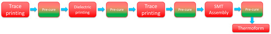 Commercial thermoformable electronic pastes and dielectric inks were printed in layers onto substrates [