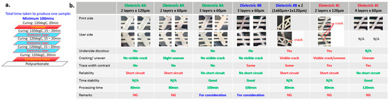 Dielectric ink types with different thicknesses were printed at 50–60 µm and 110–120 µm and cured. They were then subjected to quality and functionality checks for the presence of cracks, conductive–dielectric interface conditions, cross-sectional appearance, reliability, repeatability, and time stability (