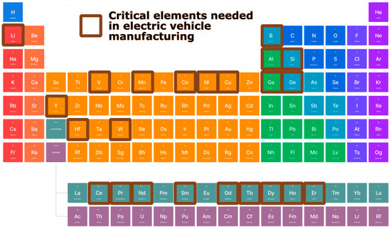 The substantial number and variety of CMs required in the manufacturing of EVs are highlighted in the periodic table of elements provided in Figure 1.