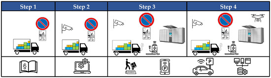 Considering these functions, the possible development of loading areas was formulated as development stages, considering the experience in Budapest and the international solutions. The suggested steps for introducing smart loading areas are presented in Figure 2. Based on these concepts, it is possible to initiate the data collection, modeling, and simulation, as now it is known what kind of data must be collected for development.