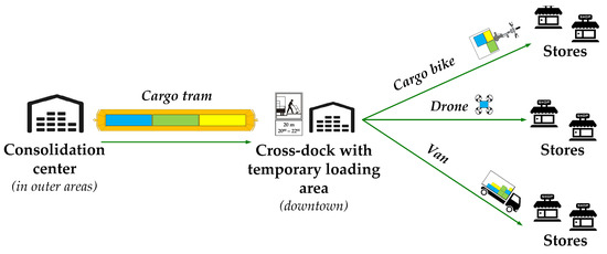 In the first concept, the lack of loading areas is handled by using urban areas multifunctionally (like in Barcelona) with temporary functions, and this multifunctional loading area is the last node in a consolidation-based city logistics system. In this concept, for deliveries into the downtown areas, cargo trams will be implemented to transport large amounts of goods without hindering road traffic and allow for a better estimation of the delivery times. Here, digital signs are needed to create temporary loading areas on the road or in a bus lane. In this concept, a potential alternative solution is that even the vehicles to be used for the last-mile delivery (e.g., cargo bikes) can be transported on the cargo tram, with a pre-loaded delivery unit, so only these should be unloaded at the loading area without temporary storage. The concept is illustrated in Figure 3.