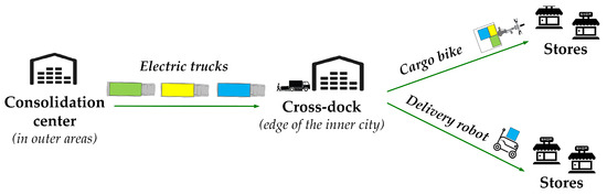 In the second concept, the focus is the challenge of restricted zones. In this concept, consolidated deliveries from the cross-dock at the border of a zone are examined. This cross-dock must perform continuous collection and distribution tasks while minimizing the storage time of the goods, and the transport is carried out with smaller devices that no longer require loading areas in the restricted zones; for example, cargo bikes can be used, or delivery robots for the smaller packages. Here, the use of robots to transport goods can be easily solved, since the restricted zones are mostly pedestrian zones, and additionally, separate lanes can be created for them. The basics of the concept are illustrated in Figure 4.