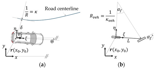 (a) Vehicle quantities and relation to the road centerline; (b) Coordinate system and related quantities of the single-track model.