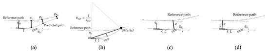 where , , and is the vehicle position at the time of planning. The geometric relations are shown in Figure 3a. The cost function also includes a term that is controversial with the output error, namely the amplitude of the steering angle. Then, the final cost function is given by Equation (3), as follows: