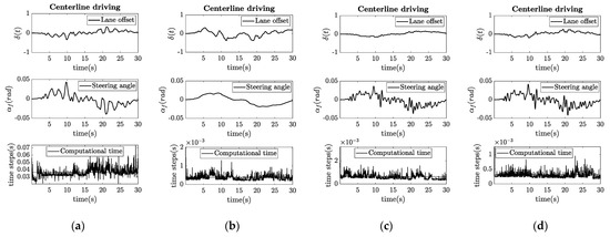 Results of experimental Test I. (a) NMPC, where the computational time is the highest, but the control error is low; (b) Pure-pursuit, resulting in smooth steering trajectory, but increased position error; (c) Stanley, having both low error and low computational time; (d) PID control.