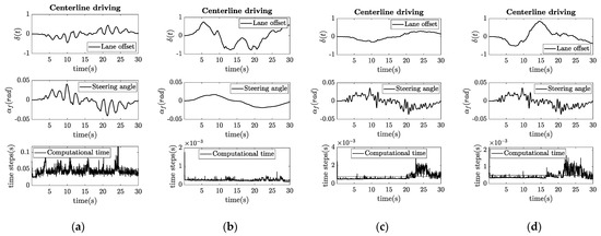 Results of experimental Test II. (a) NMPC, with increased output error; (b) Pure-pursuit, where increased look-ahead time results in more significant curve cutting; (c) Stanley, where less strict control results in higher error but lower computational time; (d) PID control, where decreased proportional gain results in higher error.