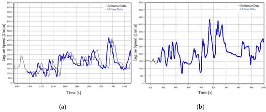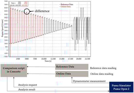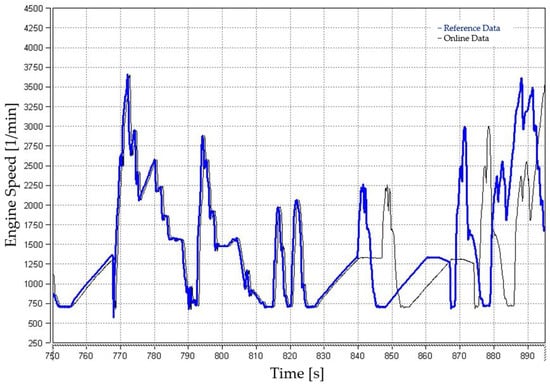 Figure 1 shows the engine speed–time trace of a randomly selected test cycle, highlighting the difference between reference and online data. A deviation of up to 5% is permissible between the actual test bench engine speed parameter and the reference data. Exceeding the 5% threshold triggers feedback from the test equipment. Depending on the automation software settings, this feedback could lead to a variety of actions ranging from a warning to the dynamometer operator to a complete halt of the test.