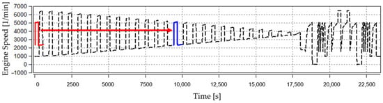 The third step involves merging and comparing the measurement data to the reference data. Synchronization is crucial for comparing two sets of data, enabling a precise comparison at a specific time point. Parameters and sample data were both analyzed at a 10 Hz frequency. A sample search was conducted, assessing events from the final 5 min of test equipment operation based on speed parameter. Within this 5 min window, the data acquisition system recorded 180,000 measurement data points for a single variable. A maximum deviation of ±7% was permitted in the sample data in 2 s increments for the entire sample data section compared to the reference data. If ±7% of the reference data ran error-free in the part of the reference data, it was assumed that the sample data had been located within the reference data. The purpose of the above identification is to pinpoint where in the reference measurement the events of the last 5 min of the measurement occur. We can see the illustration of this in Figure 2, where the data marked in red represent the data generated in the last 5 min of the dynamometer measurement, which need to be aligned with the reference data, while the data marked in blue show the correct alignment with the sample data.