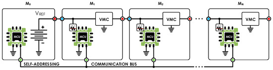 In a master-slave communication model, the M0 node equipped with an MCU (Microcontroller Unit) typically acts as the master of the network, while the M1...MN nodes function as slaves, highlighting the connection to the referenced role allocation in the context-based addressing method. Master nodes are capable of forming their own sub-network of slave nodes while they setup and maintain a hierarchical network with adjacent master nodes as an efficient response to scalability. Alternatively, the M0 node could be a simple node only providing the voltage reference required to initiate the chain. In this topology, it is up to the M1...MN nodes to determine when and which node assumes the master role at the expense of scalability in favor of simplicity.
