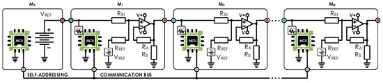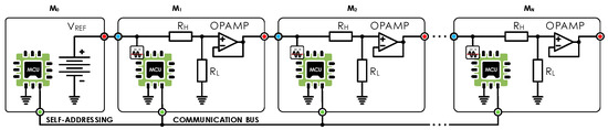 In addition, LTSpice simulations were conducted to validate the hardware aspects, resulting in an effective hardware implementation that involved one master (M0) and eight slave (M1 to M8) nodes. The self-address determination algorithm was tested and validated on a low-energy type 16-bit MCU.