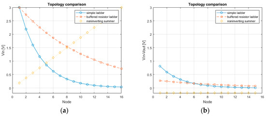 The resistor values used for the ladders were RH = 1000 Ohms and RL = 10,000 Ohms, resulting in a divider ratio of 1:11 for the ladder topology. It was assumed that the microcontroller can measure within a range of 0 V to 3 V. In the case of the simple and buffered resistor ladder approach, the chain of nodes was supplied with a 3 V input. For the non-inverting summer ladder approach and configuration with 16 nodes, the reference voltage was set to 187.5 mV (3 V divided by the number of nodes). The simulation results for various topologies extended to 16 connected nodes are presented in Figure 5a, featuring overlapping graphs for better comparability.