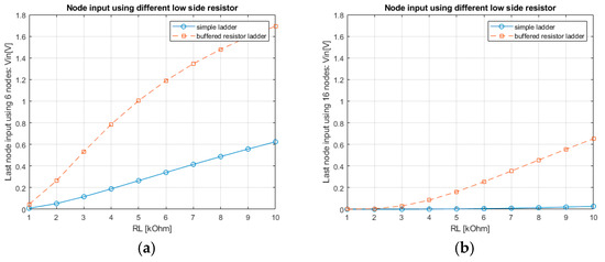 The optimal values for the last node voltage are achieved with RL = 10 kOhms. For the simple ladder approach, this configuration is effective for six nodes, as shown in Figure 6a, where the last node voltage remains above 0.8 V. However, with 16 nodes, even with RL = 10 kOhms, as shown in Figure 6b, the last node output drops below 50 mV, making it susceptible to ground noise interference. Increasing the RH/RL divider ratio results in a reduced voltage drop across the VMC, which makes it more challenging to distinguish between node voltages. However, the benefit is that more nodes can be connected in series before the node voltage falls below the 50 mV threshold.