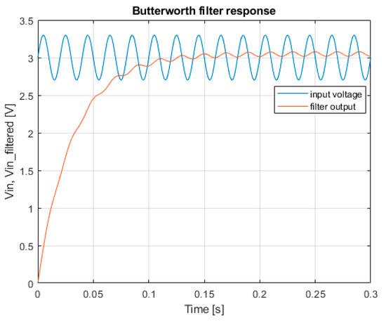 where x represents the input signal measured with a 1 kHz sampling frequency, and y denotes the filtered output. The filter’s relatively slow response is illustrated in Figure 7, reaching a steady state approximately 150 ms after the initial input.