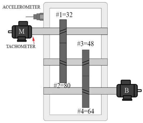 The present research does not include actual vibration data collection but relies on an existing database to create the operational dataset. The dataset was obtained from an external database containing vibration signals collected from gearboxes monitored under five different conditions [7]. These vibration signals are information-rich signals showing the operating state or condition of a gearbox system, offering the flexibility of assessing the performance and health of a system through numerous methods [8]. The dataset was obtained from the gearbox assembled using a two-stage gear stage. Figure 1, which is edited by us based on [7,8], shows this setup, where the input shaft’s speed and gearbox vibration signals were measured using a tachometer and accelerometer, respectively.