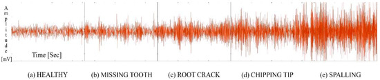 The data are available at a 20 kHz sampling rate to have detailed data on the dynamic response vibrations of the gearbox [8]. However, the time resolution of the pictures is less than 20 kHz: there are about 800 datapoints per revolution. With a total of 500 time-histories obtained from the database, the five gear conditions mentioned above were used in our research: (a) healthy, (b) missing tooth, (c) crack, (d) spalling, and (e) chipping tip. Note that all samples of condition e) were pooled and reduced to see if the recognition of chipping tip faults is still reliable. This created a comprehensive dataset that is exploited to efficiently train and test our model’s fault-detection capabilities. The proportionality of the samples created an almost perfect balance that helped to realize the required balance in the learning set. In addition, the five different gear conditions, each identified by 100 samples, provided the data required to realize the faults. Also note that a wide array of samples presented diversity in the vibration signal, which ultimately strengthens our diagnosis results. The database includes images, which are an alternative of numerical data in some vibration measurement software tools. Figure 2 shows vibration signals for each set of the gear condition. Ultimately, the graphically interpreted vibration data form the basis of our research, from which we make an identification, mainly based on the identification features of each fault.