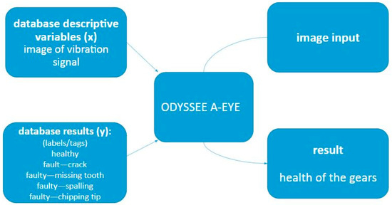 The main goal of this work is the extraction of the fault categorization features from the data. The presented concept is that feature categorization is delegated to the industrially developed ML model. This paper has presented the research and results obtained from the work, which displays the enormous possibilities of ML methods, namely edge detection and maximized pooling with the help of the INVD method, in the field of the diagnostics of gearbox faults using vibration signal imaging. The model was first created with the help of the ODYSSEE-A Eye and then tracked and diagnosed with a 96% accuracy the gearbox fault states from the 500-sample dataset in the real experiment. Although, this dataset is smaller than that used in [7,8], the reliability of the classification results for chipping tip failure was good. The performance of the model once again confirmed the ability of the proposed method to find and diagnose gearbox faults with great accuracy early on. The high performance of the model suggests not only its practical significance but also the importance of applying various machine and image-processing methods in improving the reliability of mechanical systems. The high fault-detection rate of the gearbox faults states before their critical degeneration will reduce downtime and the maintenance costs incurred, thereby improving plant-level operational efficiency.