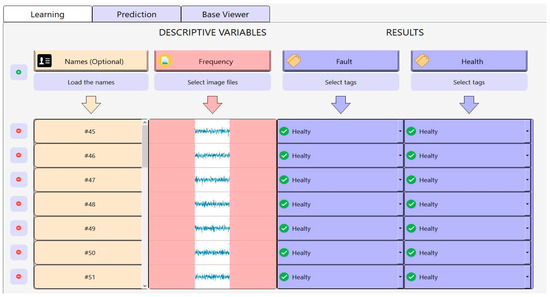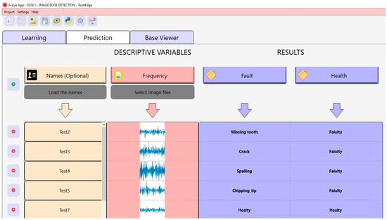 The results contain valuable data about the precision and reliability of gearbox fault classification. Figure 6 presents an interface for an ML application designed for image-based fault detection. Specifically, out of 50 test data samples, which included 10 samples of each of the five fault conditions, the model generated 48 reliable results. This yields 96%, which can be regarded as a high accuracy rate for the area of ML and industrial diagnostics. One of the two incorrect results turned out to be equally distributed between the two samples identified as healthy gearbox samples. In terms of the amplitude peaks, those identified for the fault and the faultless cases were slightly higher than the average peak of the healthy gearbox sample, and the model made a slight mistake in identifying them. This reveals the need to refine the ML model further, make it more complicated, and be sensitive to even the most subtle deviations from the patterns of healthy gearboxes.