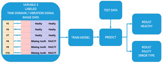 We applied a model within the ODYSSEE-A Eye platform, to forecast potential faults in gearbox gears based on vibration signal analysis [12]. The model’s primary function should be to identify the potential for failure early on, allowing for its prevention and elimination. The model operates by analyzing descriptive variables (X), derived from time-domain vibration signals, to provide outcomes (Y), which are categorized into the following fault types: (a) healthy, (b) missing tooth, (c) root crack, (d) spalling, and (e) chipping tip, as illustrated in Figure 3.