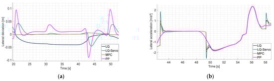 Considering the dynamic test track, all controllers meet the stability and comfort requirements as expected. However, as anticipated, gain scheduling improves the controller performance significantly. Considering the overall results, the MPC performs best, with negligible position errors and acceptable acceleration values. The LQ and LQ-Servo controllers have slightly larger deviations and similar lateral acceleration. The Pure Pursuit controller has the worst performance regarding tracking accuracy, especially in sharp turns, which confirms our initial assumptions.