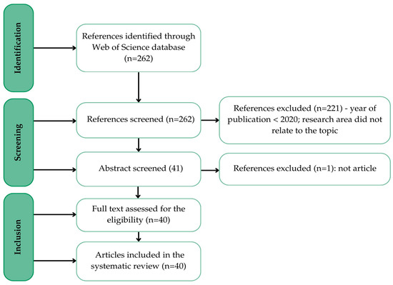 The keyword search yielded a total of 262 results. The period considered was 2020–2024, which already contained fewer publications, at 154 publications. Further filtering was applied by research area, with the inclusion criterion being that the research area was business economics. A further inclusion criterion was that the publication type was articles, resulting in 40 records, all in English (the exclusion criteria would have been a language different from English). The results of the search using the inclusion and exclusion criteria are illustrated in the following Figure 1.