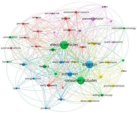 Furthermore, network analysis organizes keywords into clusters. In the case of this research, four clusters emerged. In the green cluster, “electric vehicles” is central, while “policy” and “infrastructure” are also key factors. The green cluster therefore mainly covers environmental and infrastructure research. The blue and red clusters mainly represent consumer-oriented research. In the blue cluster, the consumer plays the central role. The main factors are “acceptance”, “consumer attitude”, and “preferences”. The red cluster is also related to the consumer, with “consumer attitude”, “acceptance”, and early technology use. So, these studies best summarize the model of acceptance of new technologies, with a particular focus on alternative propulsion vehicles. While it is true that the study of electric vehicles dominates, the technology acceptance models identified towards them may also be relevant for other AFVs. Sustainability aspects of the topic should also be considered. AFVs typically aim at reducing negative impacts on the environment. The purple cluster brings together research that has specifically addressed the environmental aspects of the topic. This cluster includes the theory of environmental concerns and planned behavior, which integrates environmental factors that influence adoption.